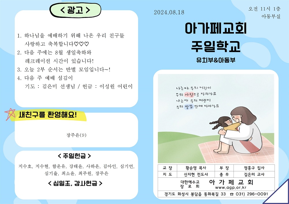 ) F. 031-296-0091 / 부설 아가페어린이집 : 031-298-9153