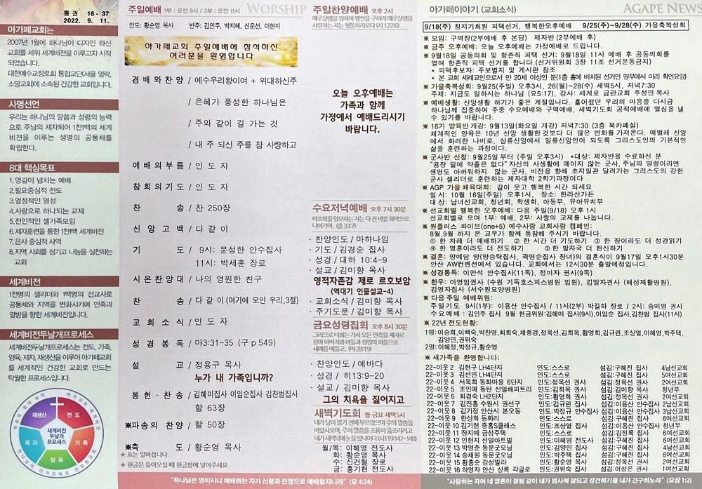 2022년 9월 11일 아가페교회 소식