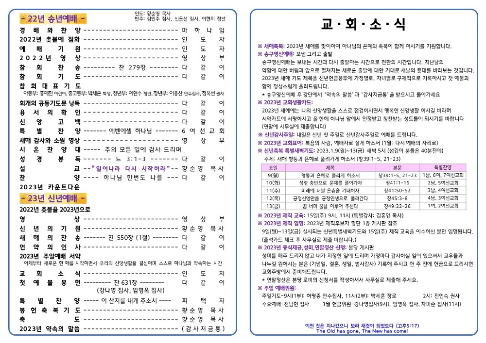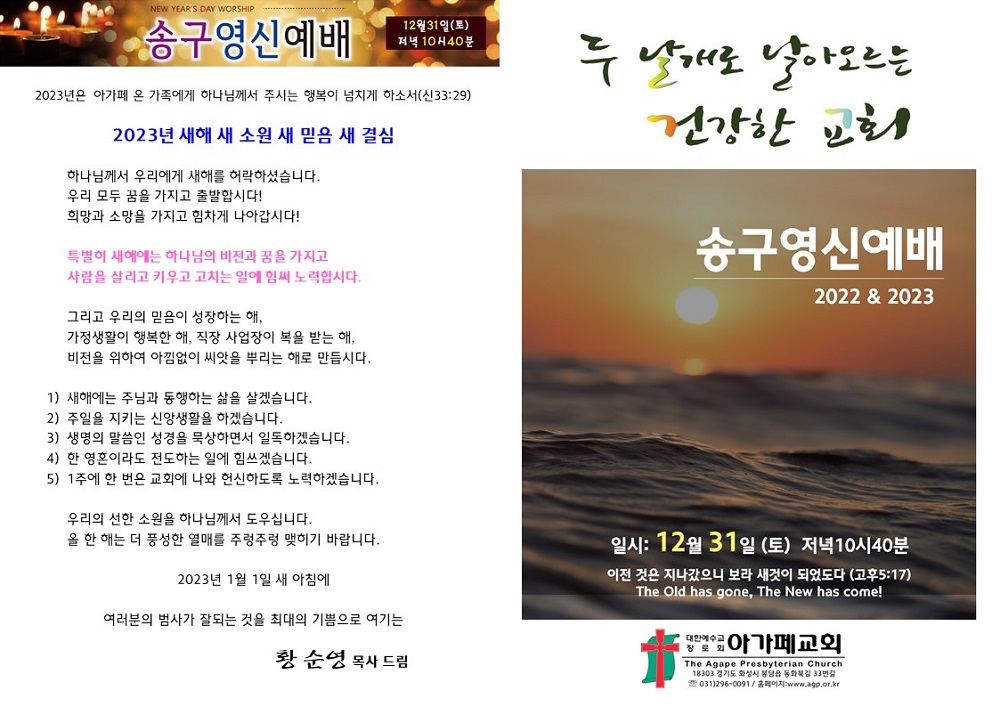 2022년 12월 31일 아가페교회 소식(송구영신예...
