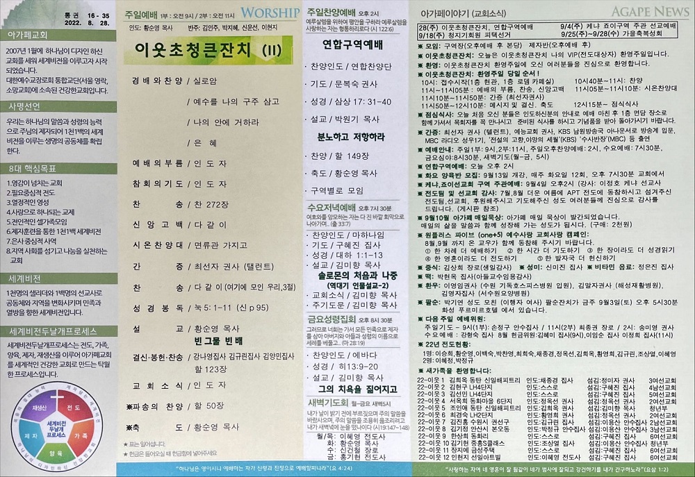 샬롬! 대한예수교장로회 아가페교회에 오신걸 진심으로 환영합니다.