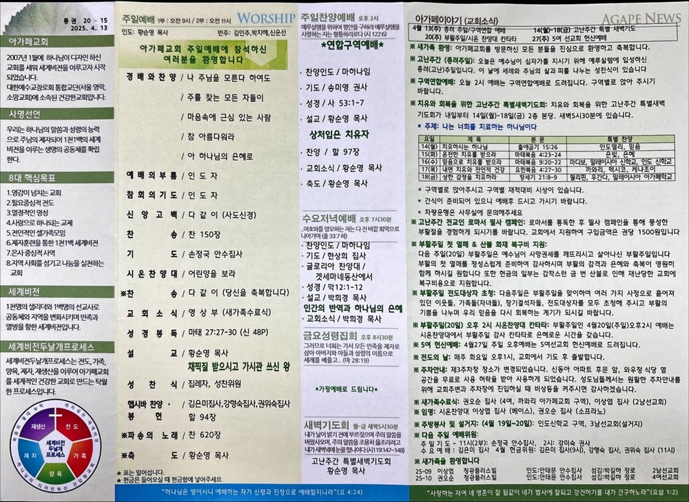 샬롬! 대한예수교장로회 아가페교회에 오신걸 진심으로 환영합니다.