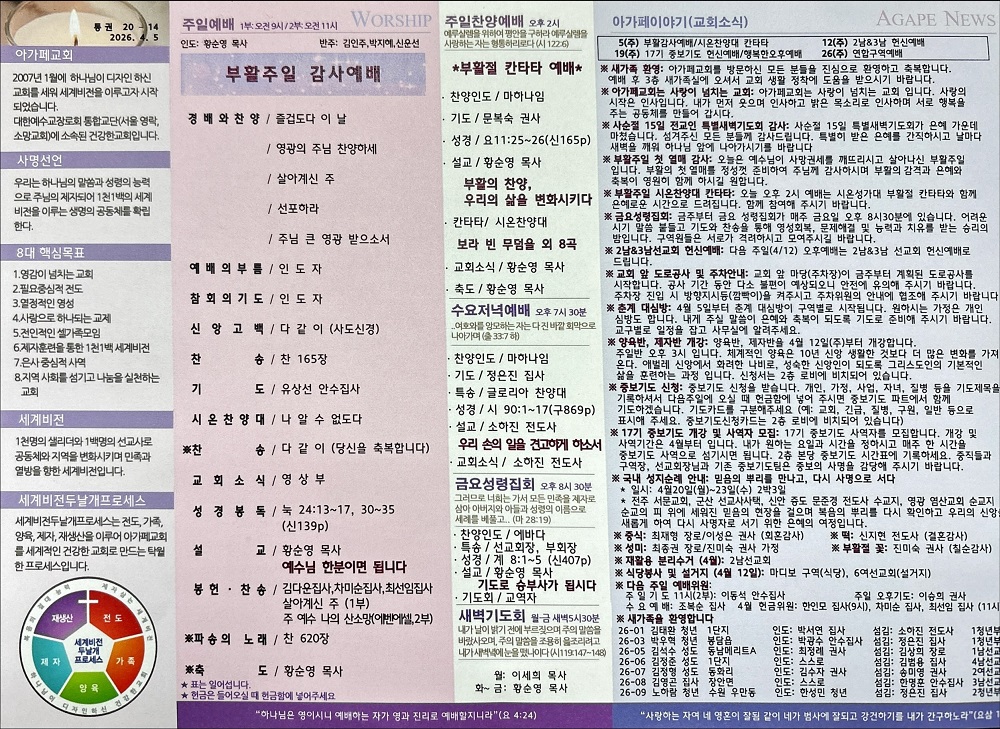 샬롬! 대한예수교장로회 아가페교회에 오신걸 진심으로 환영합니다.