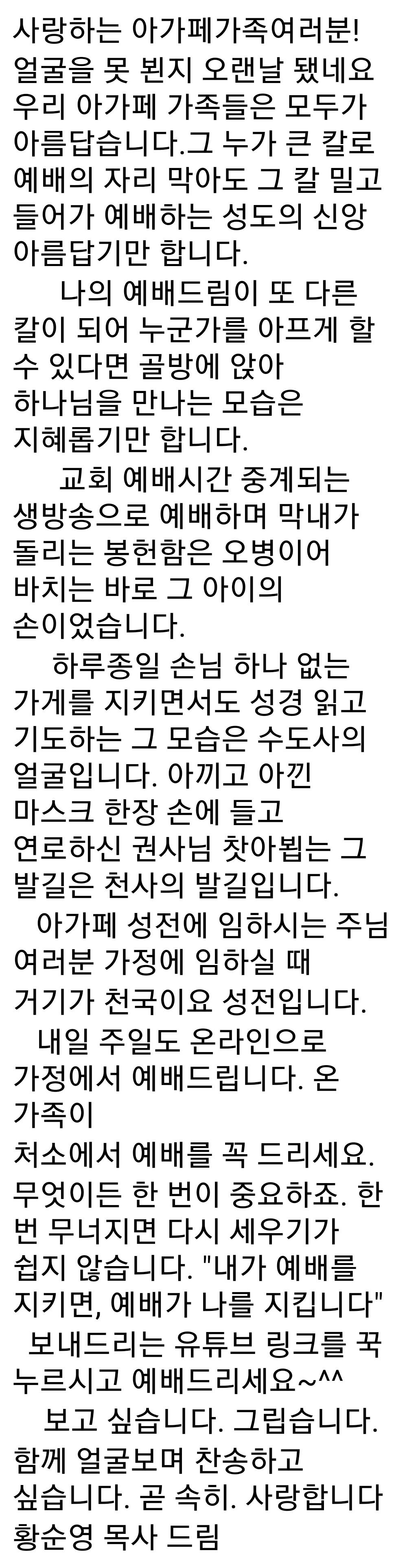 샬롬! 대한예수교장로회 아가페교회에 오신걸 진심으로 환영합니다.