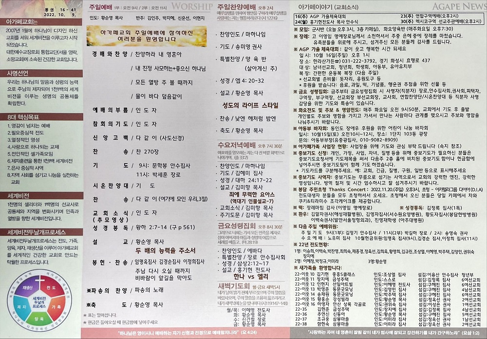 2022년 10월 9일 아가페교회 소식