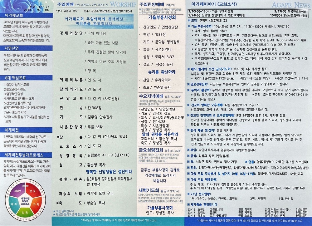2023년 9월 10일 아가페교회 소식
