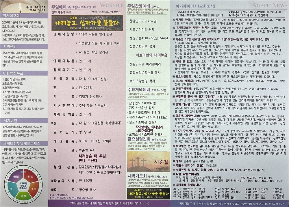 2026년 3눵 22일 아가페교회 소식