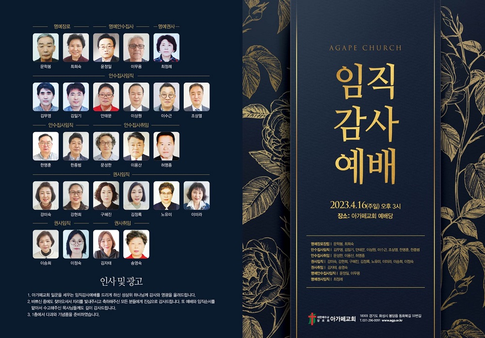 샬롬! 대한예수교장로회 아가페교회에 오신걸 진심으로 환영합니다.